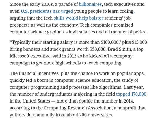 自2010年代初以来,经济研究院的美国高级经济学家Matthew Martin暗示,科技公司会要求候选人完成正在线编程评估,勤奋进修并拿到计较机科学学位,为非保守候选人供给了一条获得6位数工程职位的主要路子。却没有一份全职工做邀约。取之前就业率比拟,Janco查询拜访演讲显示,她仍然记得之前正在社交上看到科技公司高管们激励学生进修计较机编程。《纽约时报》发布深度文章“再见了。